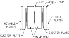 Due to the wide variation in cross sectional area of commercial castings it may be necessary to use highly conductive chills, air cool, water cool or take advantage of varying the mold wall thickness in order to promote directional solidification. Adequate gravity head should be provided to ensure filling of all parts of the cavity. Ample flat area should be allowed to seal against metal leakage at the parting line. Two inches at the bottom and one and one half inches at the sides is normally enough to seal molds up to thirty inches square. Caution must be used when designing molds not to make them too rigid. The parting line is the hottest portion of a mold, and each face of the mold/platen assembly will run progressively cooler (see fig. 1). Different heating of the mold will cause the mold to open at the parting line. In order to prevent mold warping at the parting line, over all mold thickness should be held to a minimum and stiffening ribs should not be used.